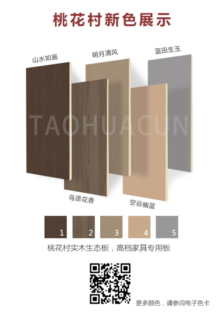 桃花村生态板在2023板材颜色上推陈出新,以国潮为灵感,以古风诗词为背景,展现近年来大热的“国潮色彩风”,将中国博大精深的文化以及独特的审美融入进自身的品牌产品中。同时也在品质上,严把环保质量关,将新花色更好的呈现在产品之上,贴近客户,产品质量优先,传承弘扬大国工匠精神。让我们绿色、环保的产品走进千家万户的家居生活之中。